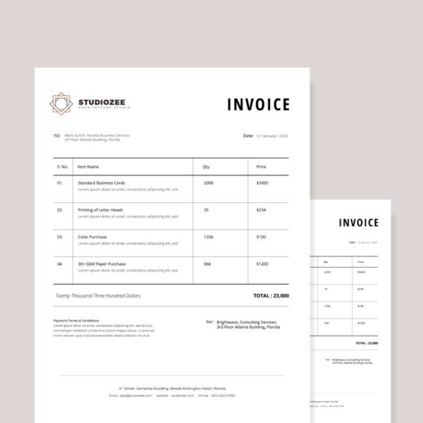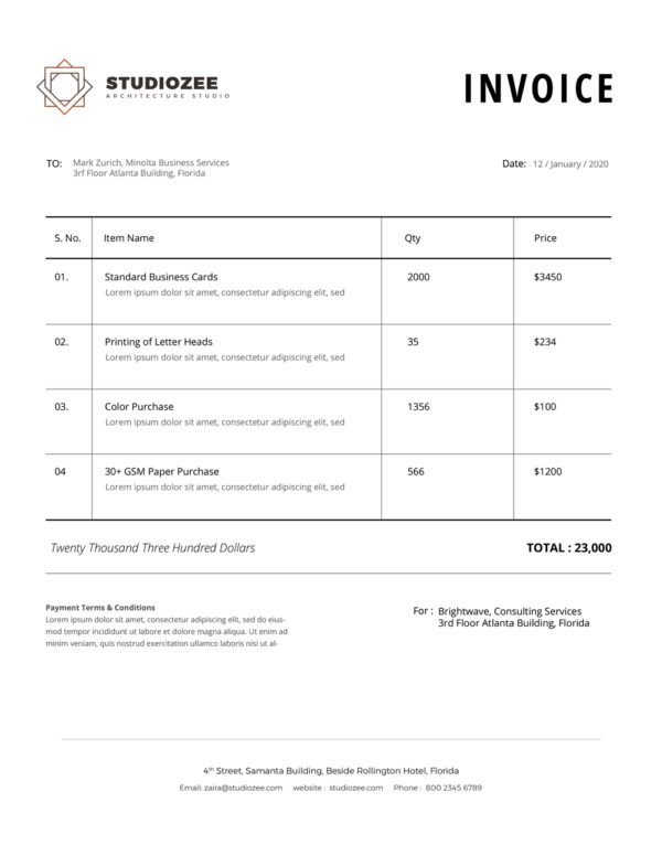 Designed for project-based billing, featuring sections for services, hours, rates, and totals.