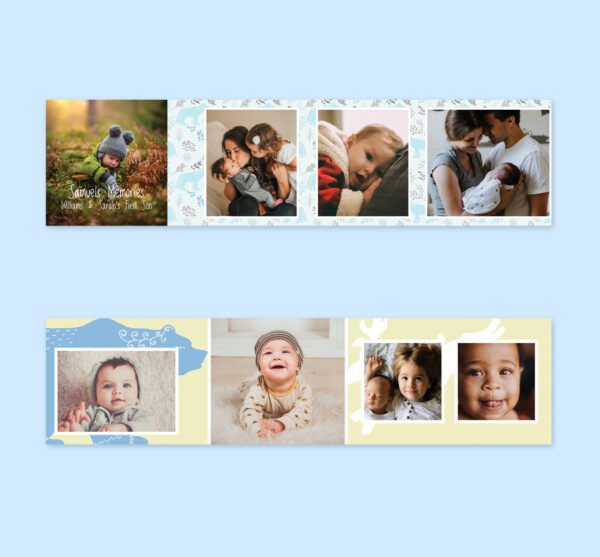 A charming 4×16 baby accordion album template that unfolds your little one’s milestones in a unique, panoramic style. Perfect for showcasing adorable moments with a playful and creative design.