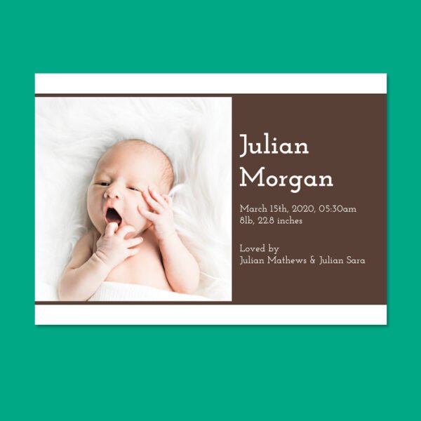 A beautifully designed Birth Announcement Card template featuring space for your baby’s name, birth details, and a photo. Perfect for sharing your joyful news with loved ones in a memorable way.