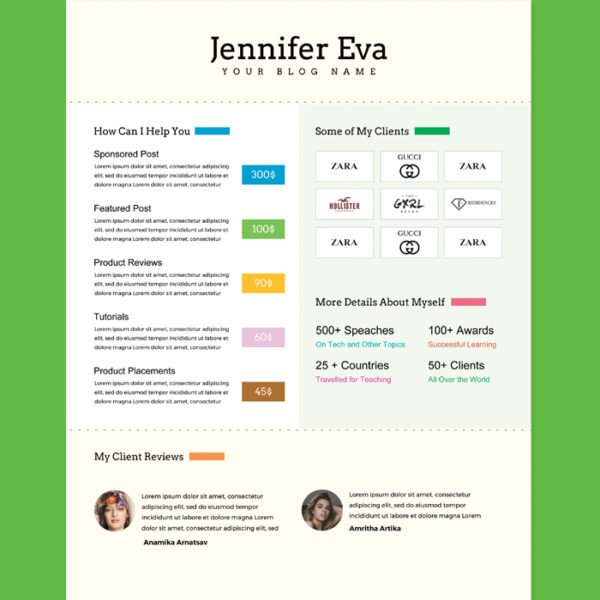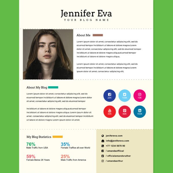 A professional Blogger Media Kit Template designed to showcase your blog’s niche, audience demographics, and collaboration services. Perfect for attracting sponsors, brands, and partnership opportunities with ease.