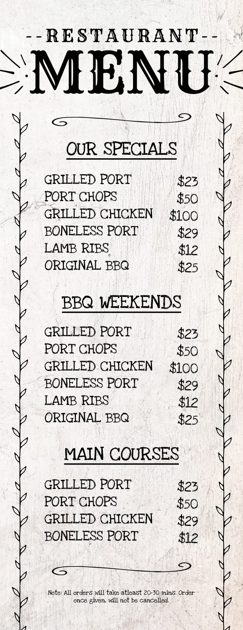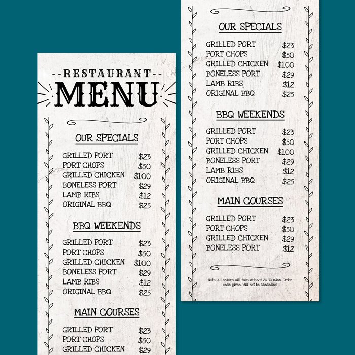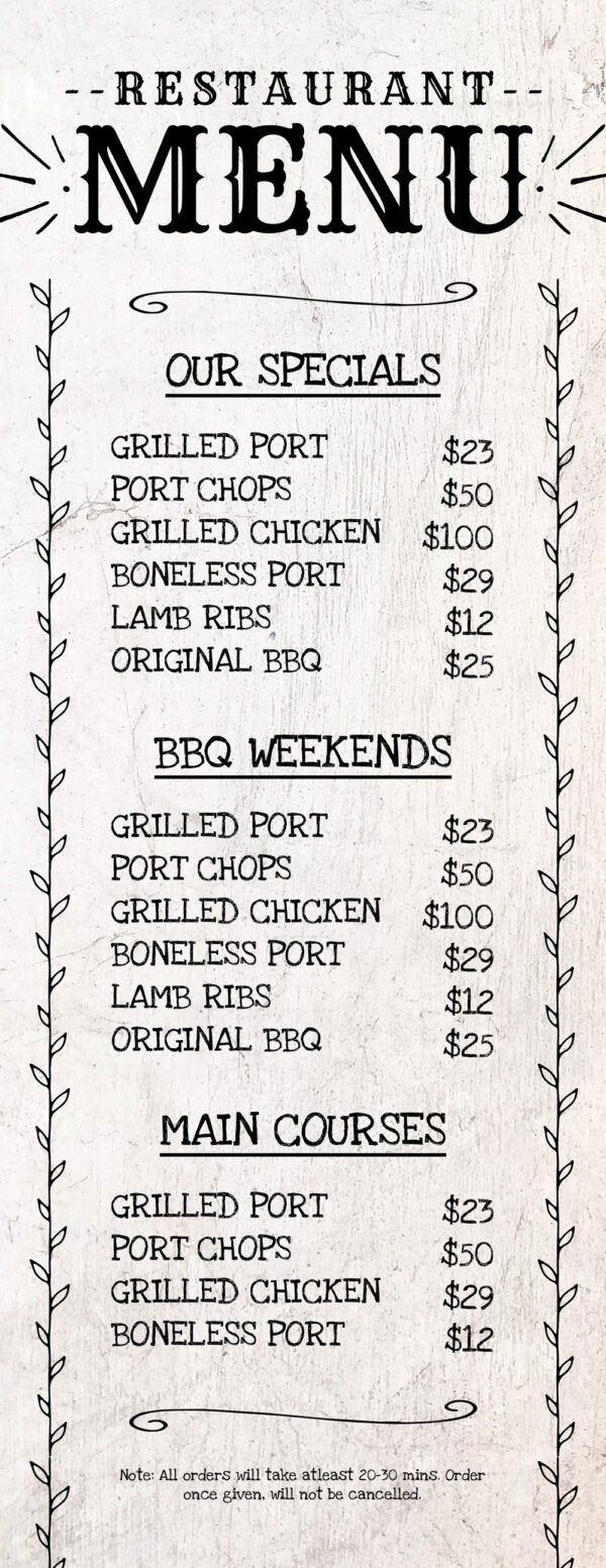 Rustic chalkboard-style menu template with hand-drawn fonts and illustrations.