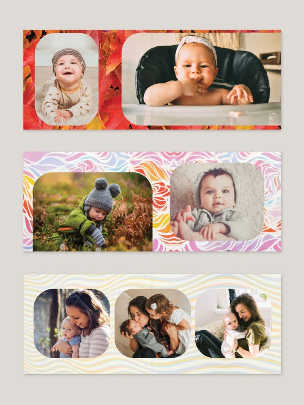 A vibrant 8.5×11 colorful baby photo album template full of playful and joyful designs.