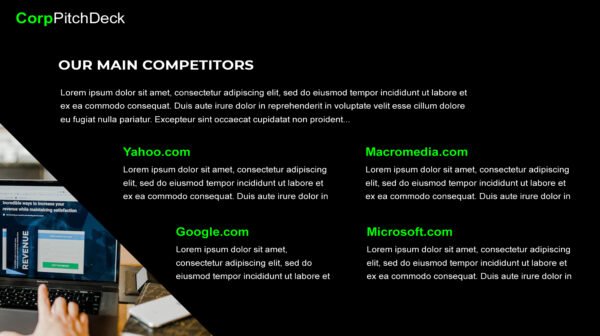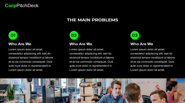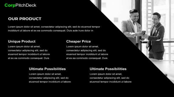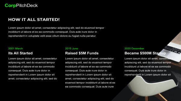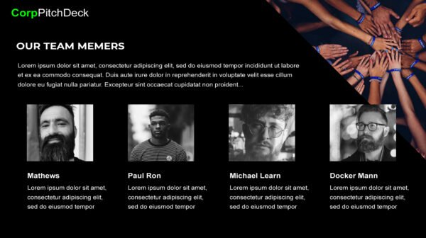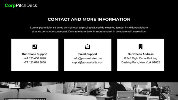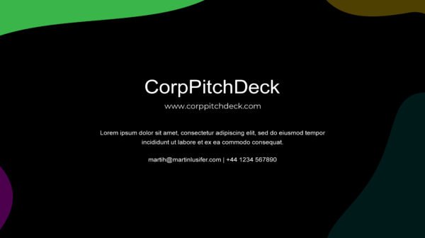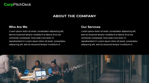A sleek and professional Corporate Pitch Deck Template tailored for established businesses to present strategies, performance, and vision. Ideal for stakeholder meetings, board presentations, and investor relations.