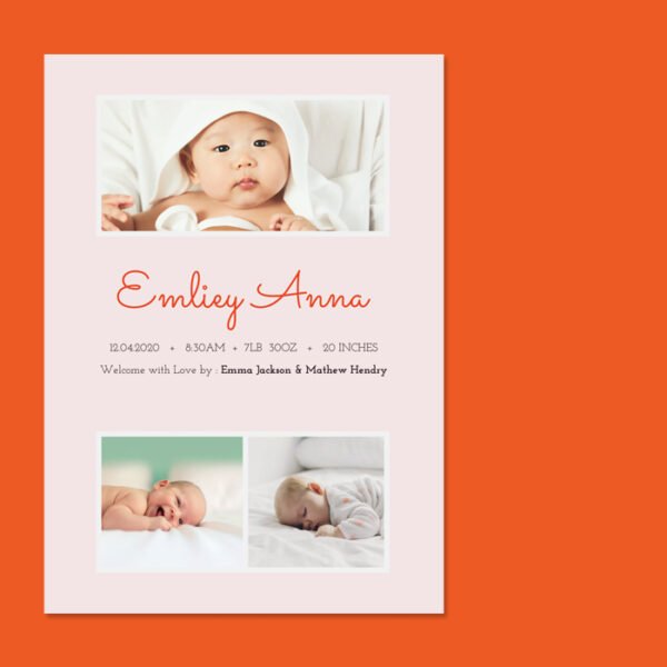 A versatile and editable Birth Announcement Card template with customizable text, colors, and images. Perfect for creating a personalized and heartfelt announcement to share your baby’s arrival.
