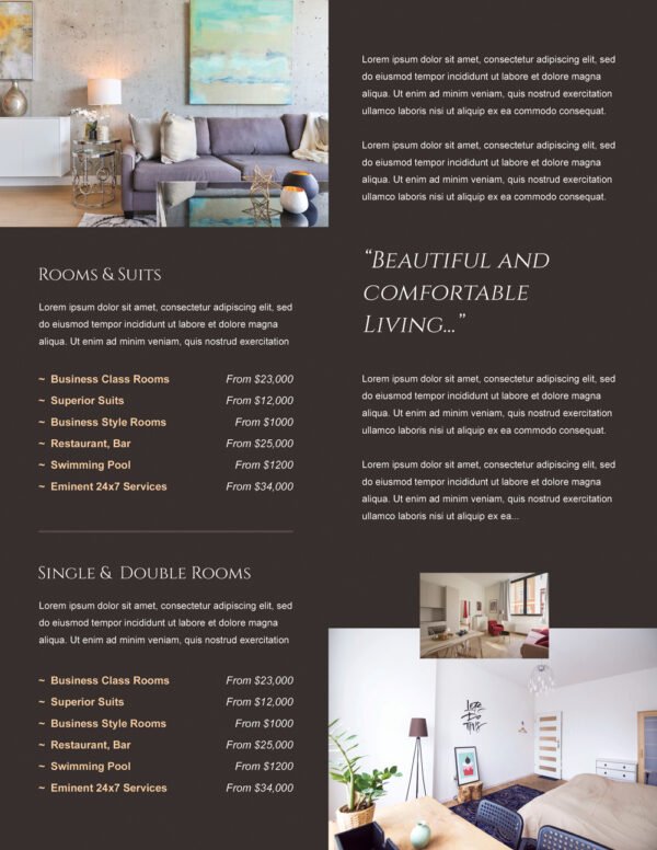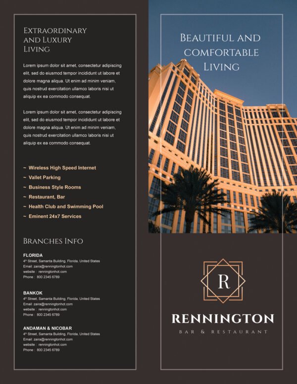 A sleek and inviting Hotel Brochure Template designed to showcase amenities, room options, and local attractions. Perfect for hotels, resorts, and hospitality businesses aiming to attract and inform guests with style.