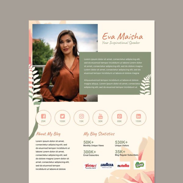 A clean and straightforward Simple Influencer Media Kit Template designed to highlight your audience, collaborations, and content style. Perfect for influencers aiming to attract brand partnerships with clarity and professionalism.