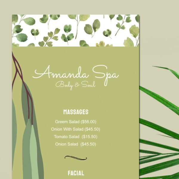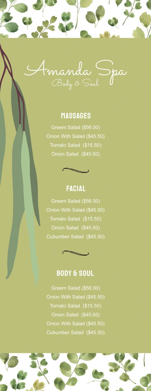 Elegant and calming spa menu template with soothing colors and clean layout.
